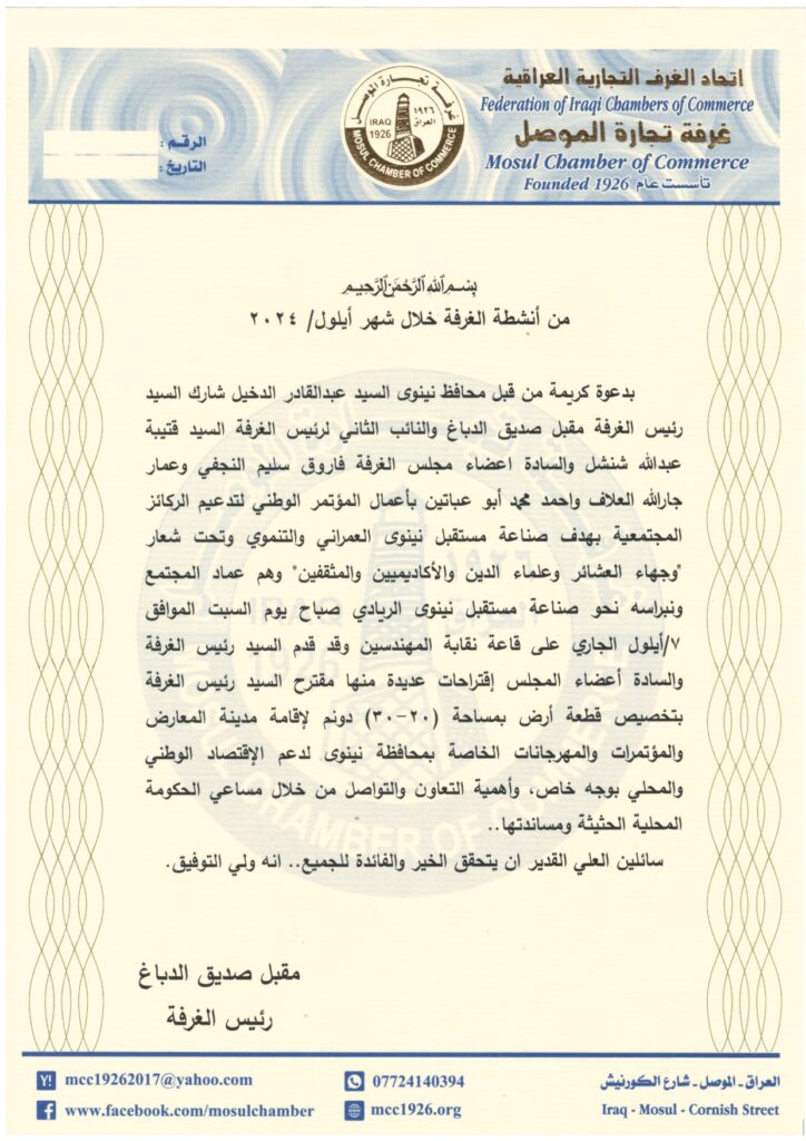 بدعوة كريمة من قبل محافظ نينوى السيد عبدالقادر الدخيل شارك السيد رئيس الغرفة مقبل صديق الدباغ والنائب الثاني لرئيس الغرفة السيد قتيبة عبدالله شنشل والسادة اعضاء مجلس الغرفة فاروق سليم النجفي وعمار جارالله العلاف واحمد محمد أبو عباتين بأعمال المؤتمر الوطني لتدعيم الركائز المجتمعية بهدف صناعة مستقبل نينوى العمراني والتنموي وتحت شعار “وجهاء العشائر وعلماء الدين والأكاديميين والمثقفين” وهم عماد المجتمع ونبراسه نحو صناعة مستقبل نينوى الريادي صباح يوم السبت الموافق 7/أيلول الجاري على قاعة نقابة المهندسين وقد قدم السيد رئيس الغرفة والسادة أعضاء المجلس إقتراحات عديدة منها مقترح السيد رئيس الغرفة بتخصيص قطعة أرض بمساحة (20-30) دونم لإقامة مدينة المعارض والمؤتمرات والمهرجانات الخاصة بمحافظة نينوى لدعم الإقتصاد الوطني والمحلي بوجه خاص، وأهمية التعاون والتواصل من خلال مساعي الحكومة المحلية الحثيثة ومساندتها..