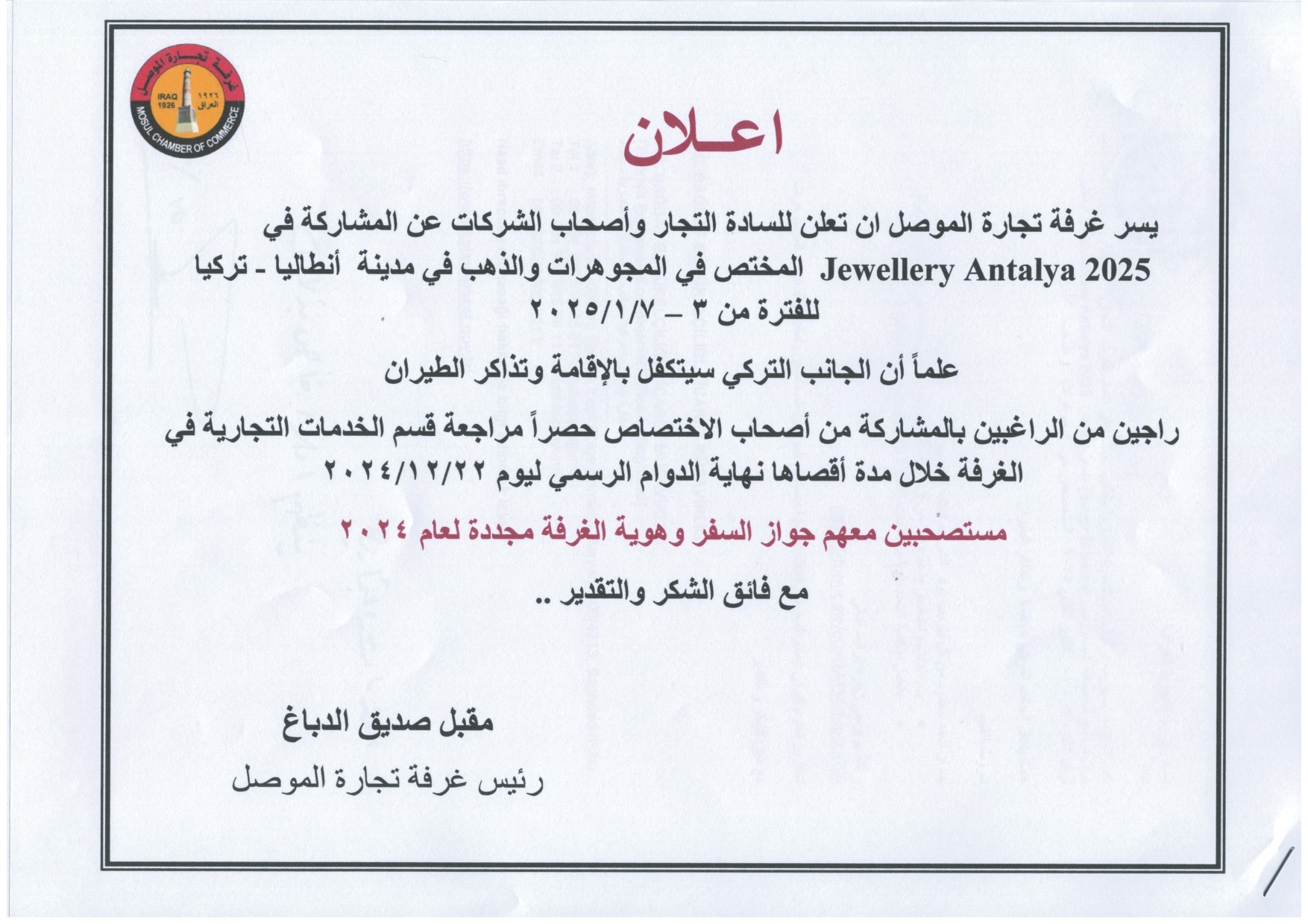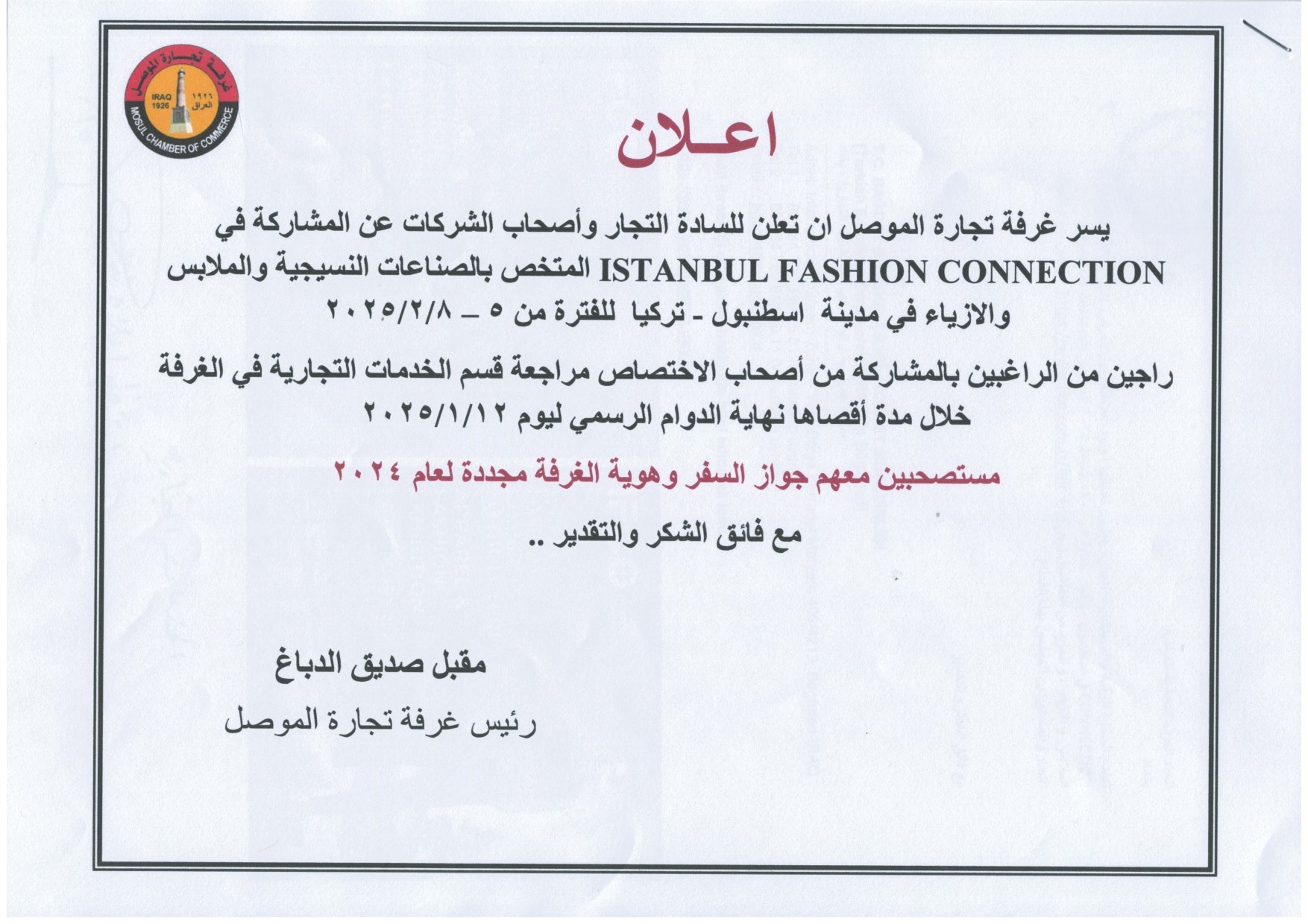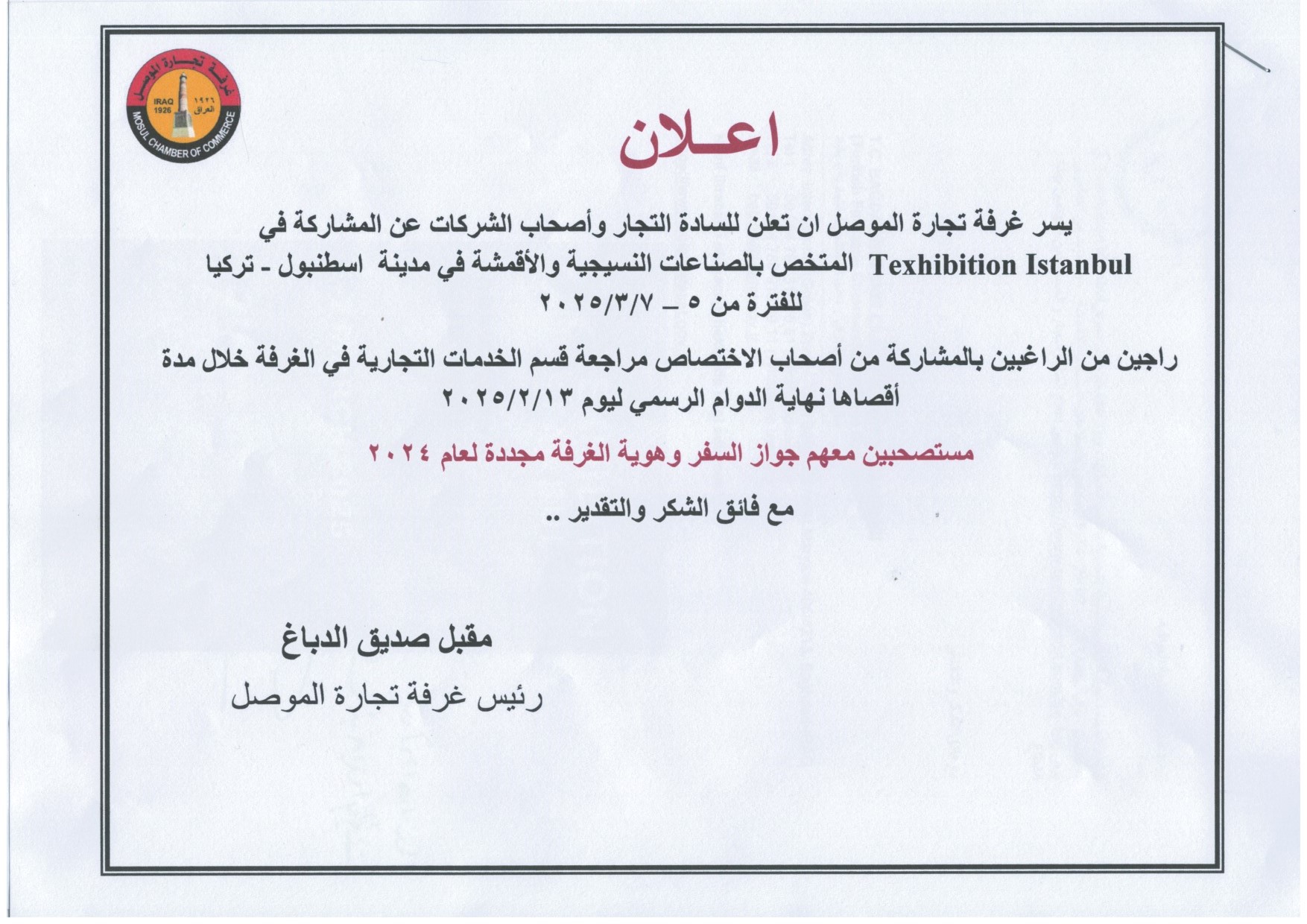 بمناسبة الحملة الوطنية الكبرى للتشجير في محافظة نينوى والمقررة برعاية رئيس مجلس محافظة نينوى الدكتور احمد يونس الحاصود المحترم اقامت الغرفة متمثلة برئيسها السيد مقبل صديق الدباغ وبحضور النائب الثاني لرئيس الغرفة السيد قتيبة عبد الله شنشل وأعضاء مجلس إدارة الغرفة والسادة التجار واصحاب الشركات التجارية الذين ساهموا بالتبرع بالأشجار