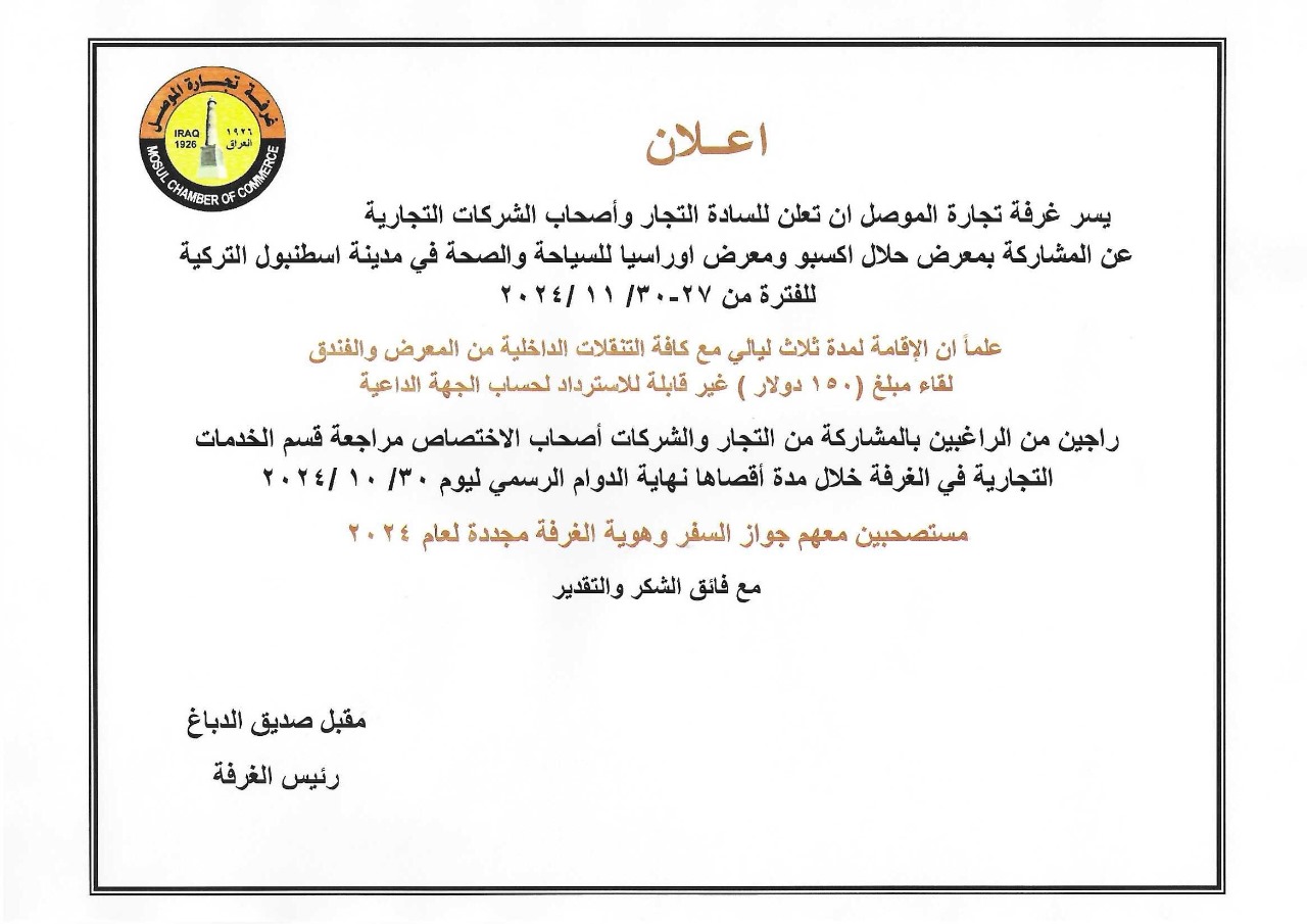 متابعة القراءةاستجابةً واستعداداً لما ابلغتنا به القنصلية التركية في الموصل عن رغبة سعادة السفير التركي ببغداد الأستاذ انيل بورا اينان يرافقه السيد القنصل التركي في الموصل ومعه الملحق التجاري وبعض منتسبي السفارة والقنصلية إضافة الى وفد تجاري يضم عدداً من التجار الاتراك واصحاب الشركات التركية بعد ظهر يوم الاحد الموافق 29/9/2024