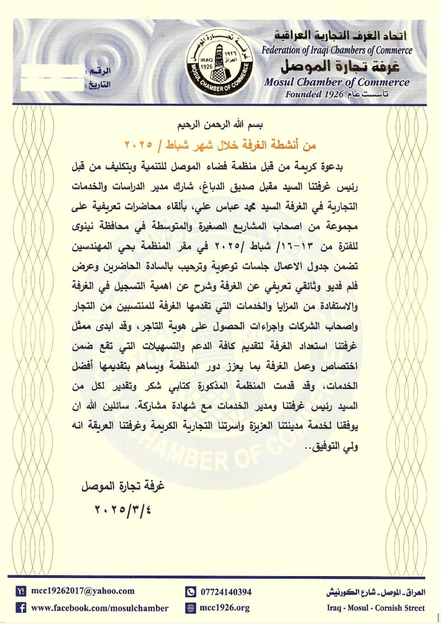 بدعوة كريمة من قبل منظمة فضاء الموصل للتنمية وبتكليف من قبل رئيس غرفتنا السيد مقبل صديق الدباغ، شارك مدير الدراسات والخدمات التجارية في الغرفة السيد محمد عباس علي، بألقاء محاضرات تعريفية على مجموعة من اصحاب المشاريع الصغيرة والمتوسطة في محافظة نينوى للفترة من 13-16/ شباط /2025 في مقر المنظمة بحي