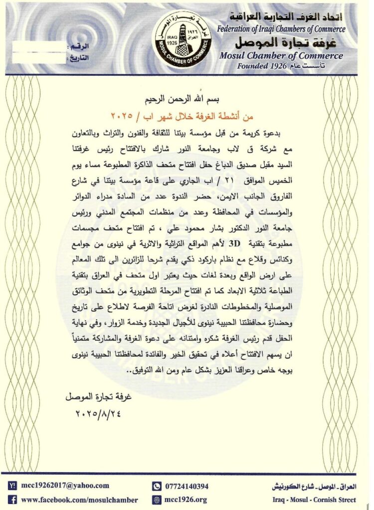 بدعوة كريمة من قبل مؤسسة بيتنا للثقافة والفنون والتراث وبالتعاون  مع شركة ق لاب وجامعة النور شارك بالافتتاح رئيس غرفتنا السيد مقبل صديق الدباغ حفل افتتاح متحف الذاكرة المطبوعة مساء يوم الخميس الموافق  21 / اب الجاري على قاعة مؤسسة بيتنا في شارع الفاروق الجانب الايمن، حضر الندوة عدد من السادة مدراء الدوائر والمؤسسات في المحافظة وعدد من منظمات المجتمع المدني ورئيس جامعة النور الدكتور بشار محمود علي ، تم افتتاح متحف مجسمات مطبوعة بتقنية 3D  لأهم المواقع التراثية والاثرية في نينوى من جوامع وكنائس وقلاع مع نظام باركود ذكي يقدم شرحا للزائرين الى تلك المعالم على ارض الواقع وبعدة لغات حيث يعتبر اول متحف في العراق بتقنية الطباعة ثلاثية الابعاد كما تم افتتاح المرحلة التطويرية من متحف الوثائق الموصلية والمخطوطات النادرة لغرض اتاحة الفرصة لاطلاع على تاريخ وحضارة محافظتنا الحبيبة نينوى للأجيال الجديدة وخدمة الزوار، وفي نهاية الحفل قدم رئيس الغرفة شكره وامتنانه على دعوة الغرفة والمشاركة متمنياً ان يسهم الافتتاح أعلاه في تحقيق الخير والفائدة لمحافظتنا الحبيبة نينوى بوجه خاص وعراقنا العزيز بشكل عام ومن الله التوفيق..
