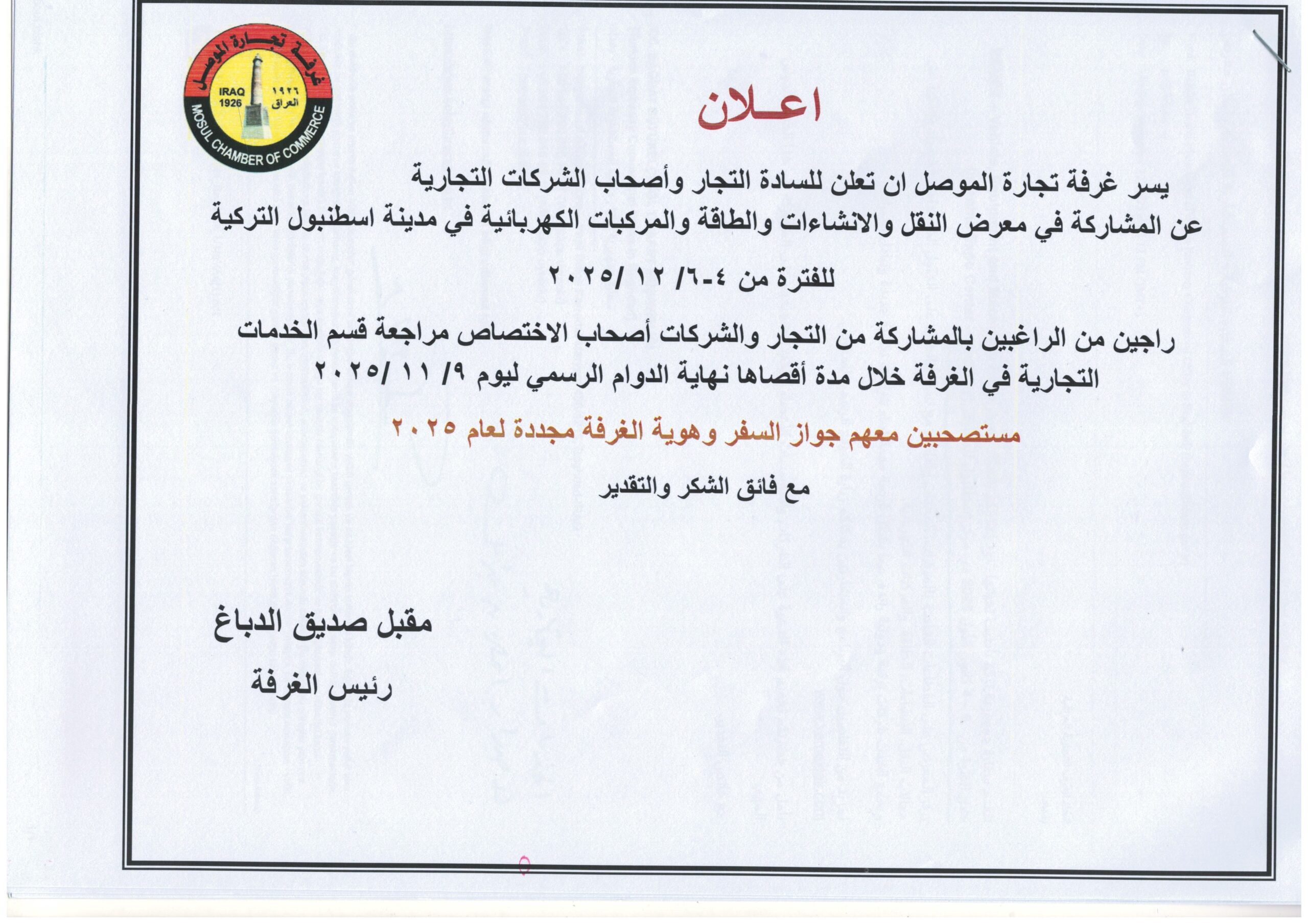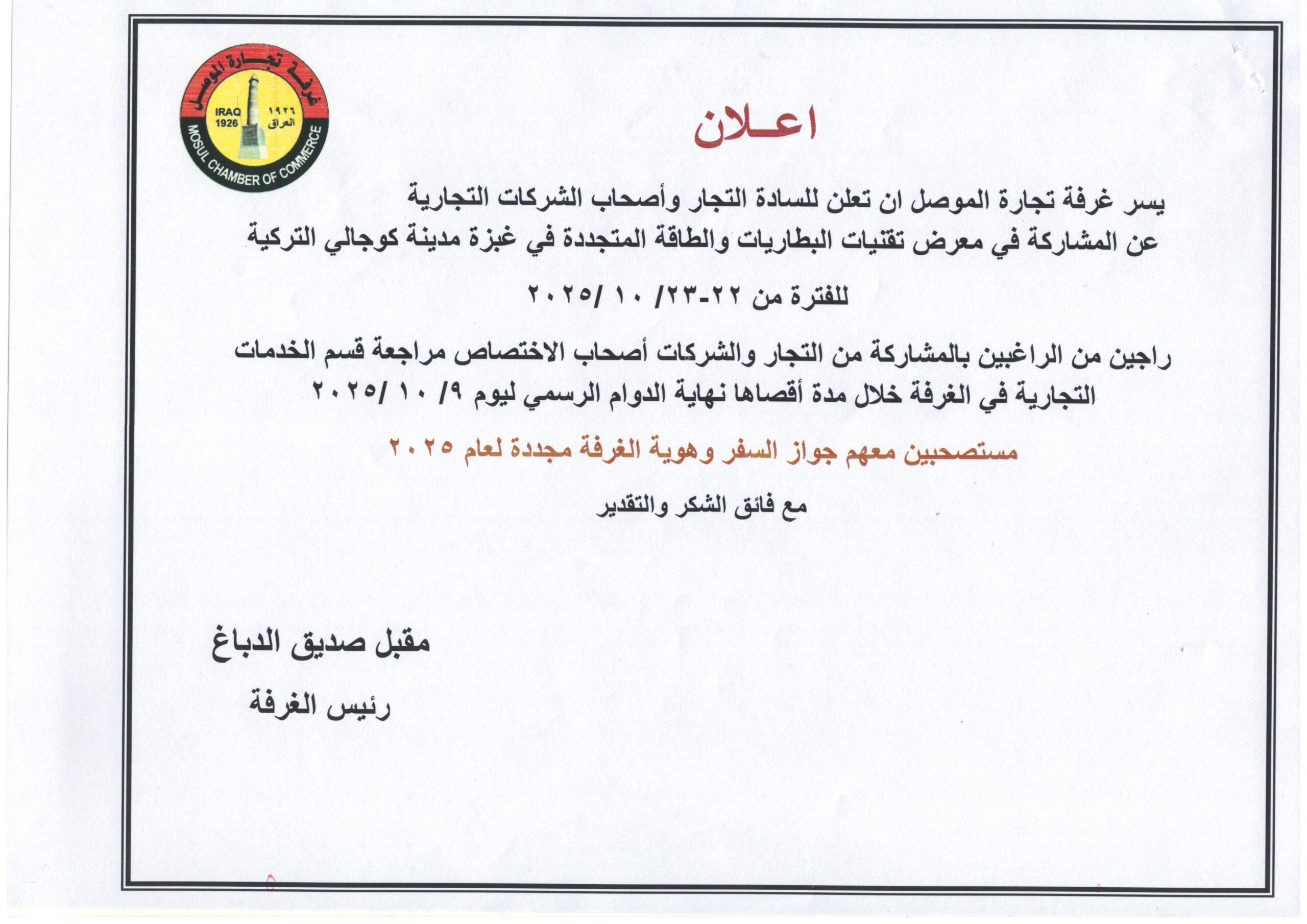 بدعوة كريمة من قبل رئاسة جامعة نينوى وبرعاية الاستاذ رئيس الجامعة الدكتور اسامة المشهداني حضر عضو مجلس ادارة الغرفة السيد محمد سالم الصفار ورشة العمل التدريبية المشتركة بين جامعة نينوى والجامعة الامريكية في بغداد على قاعة المؤتمرات في كلية التمريض لجامعة نينوى صباح يوم الاحد الموافق 21/ ايلول الجاري ،