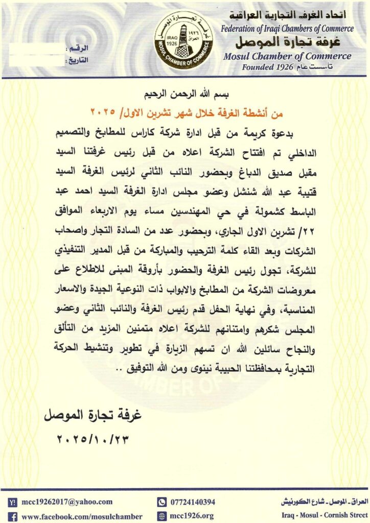 بدعوة كريمة من قبل ادارة شركة كاراس للمطابخ والتصميم الداخلي تم افتتاح الشركة اعلاه من قبل رئيس غرفتنا السيد مقبل صديق الدباغ وبحضور النائب الثاني لرئيس الغرفة السيد قتيبة عبد الله شنشل وعضو مجلس ادارة الغرفة السيد احمد عبد الباسط كشمولة في حي المهندسين مساء يوم الاربعاء الموافق 22/ تشرين الاول الجاري، وبحضور عدد من السادة التجار واصحاب الشركات وبعد القاء كلمة الترحيب والمباركة من قبل المدير التنفيذي للشركة، تجول رئيس الغرفة والحضور بأروقة المبنى للاطلاع على معروضات الشركة من المطابخ والابواب ذات النوعية الجيدة والاسعار المناسبة، وفي نهاية الحفل قدم رئيس الغرفة والنائب الثاني وعضو المجلس شكرهم وامتنانهم للشركة اعلاه متمنين المزيد من التألق والنجاح سائلين الله ان تسهم الزيارة في تطوير وتنشيط الحركة التجارية بمحافظتنا الحبيبة نينوى ومن الله التوفيق ..
