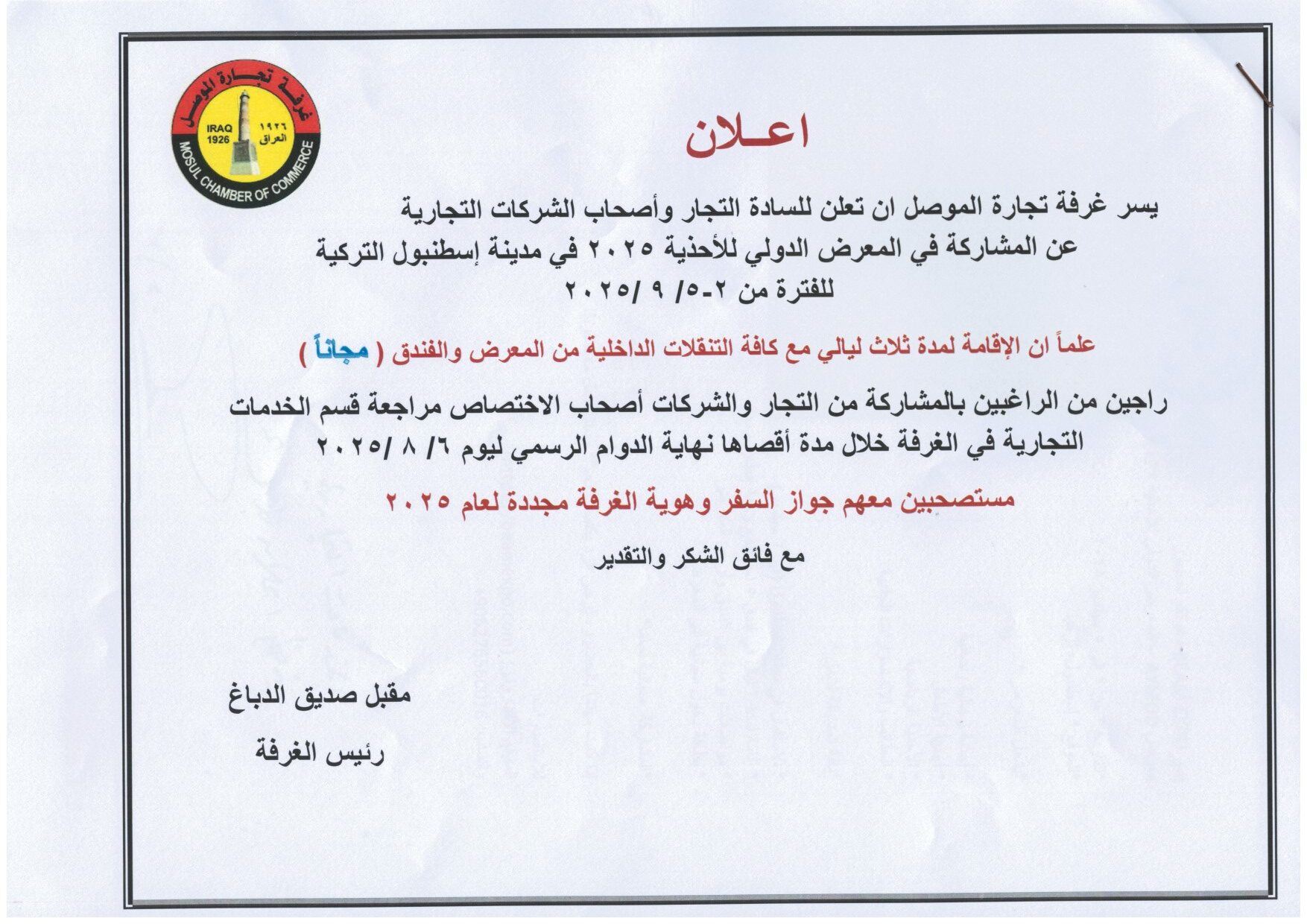 شارك رئيس غرفتنا السيد مقبل صديق الدباغ بملتقى ومارثون العدالة الاول والذي أقيم بأشراف رئاسة محكمة استئناف نينوى ، وقد أقيم الملتقى على مسرح جامعة الموصل صباح يوم الاثنين الموافق 21/ تموز الجاري، والذي حضره رئيس جامعة الموصل ومدير عام البنك المركزي في نينوى وعدد من السادة مدراء الدوائر والمؤسسات