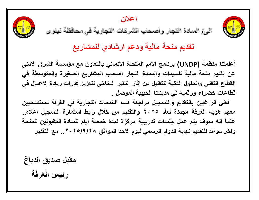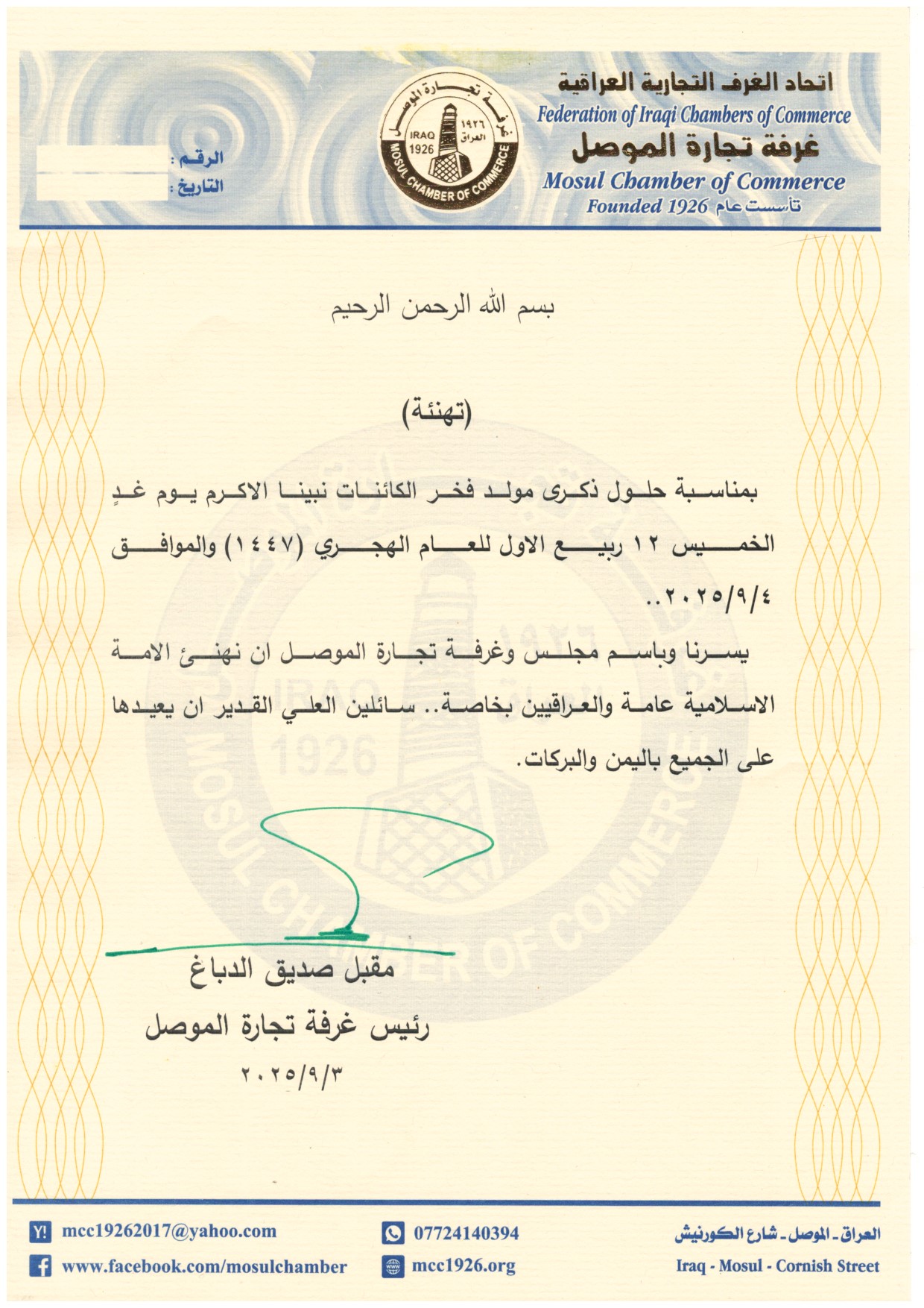 متابعة القراءةبرعاية مجلس محافظة نينوى لجنة الخدمات وشؤون البلديات عقدت الغرفة متمثلة برئيسها السيد مقبل صديق الدباغ وبحضور النائب الاول لرئيس الغرفة السيد يوسف كداوي والنائب الثاني لرئيس الغرفة السيد قتيبة عبد الله شنشل واعضاء مجلس ادارة الغرفة صباح يوم الخميس الموافق 28/ اب الجاري على قاعة المؤتمرات في الغرفة ندوة